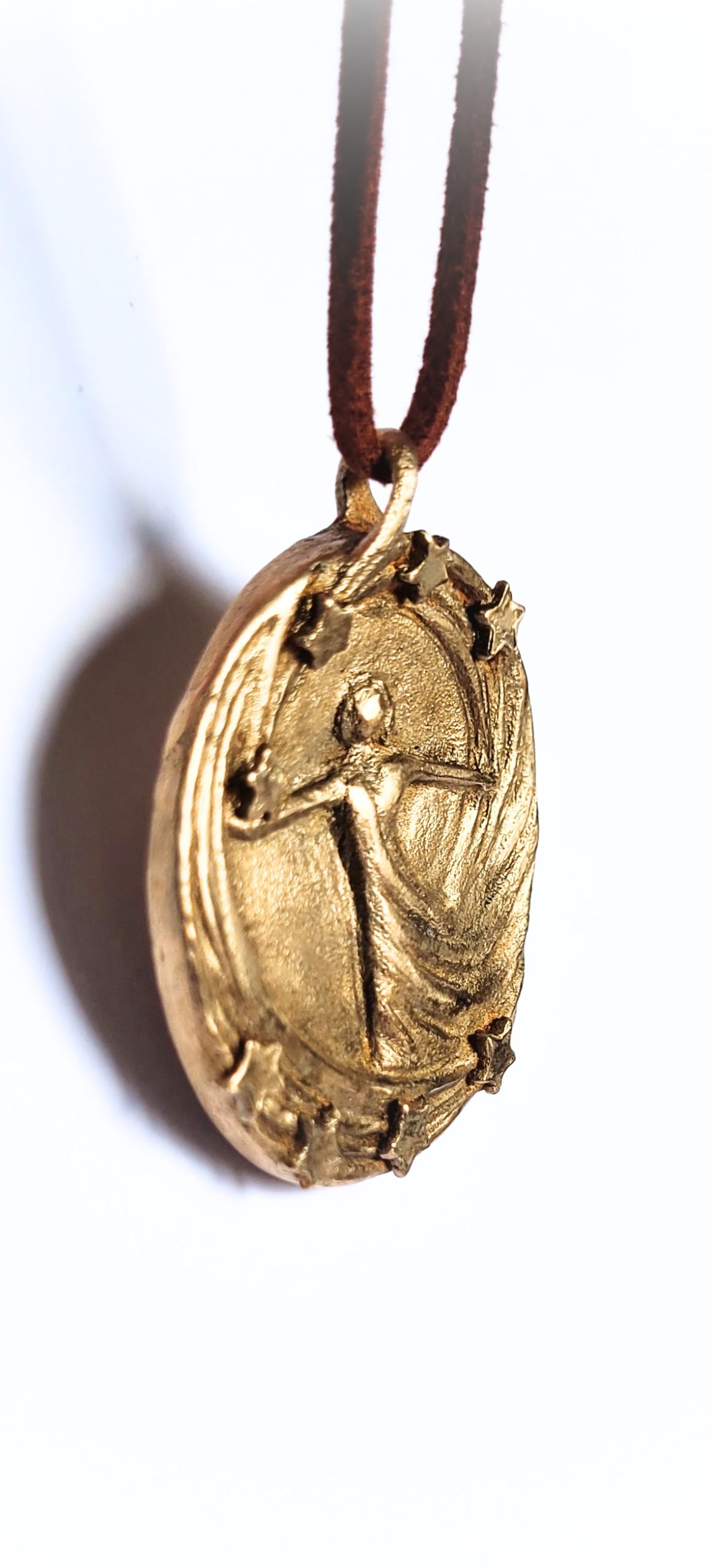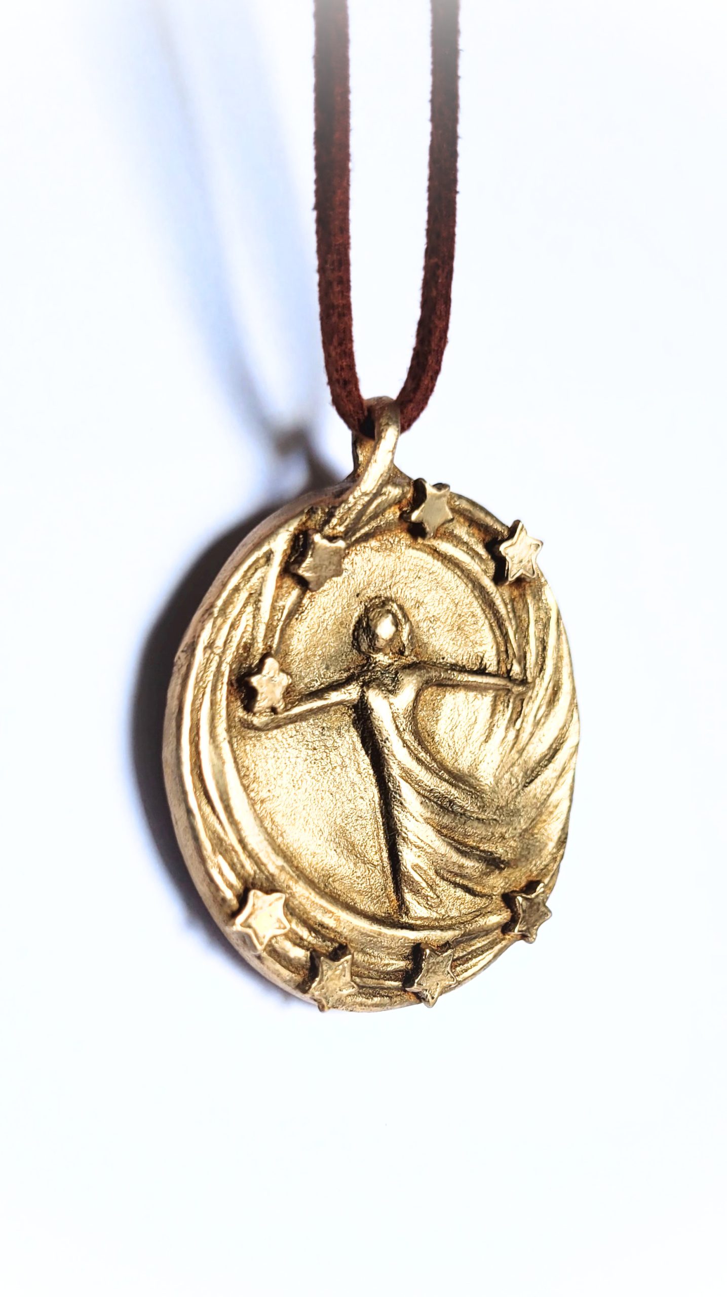 Diese handgefertigte Schmuckmedaille aus Bronze verbindet die tanzende Figur mit einem leuchtenden Sternenkranz – ein kleines Universum, das du am Hals tragen kannst. Die Figur öffnet die Arme weit, während sich Sterne wie ein Nachthimmel um sie legen: oben wie gehalten in der Hand, unten wie ein schützender Bogen aus Licht.
