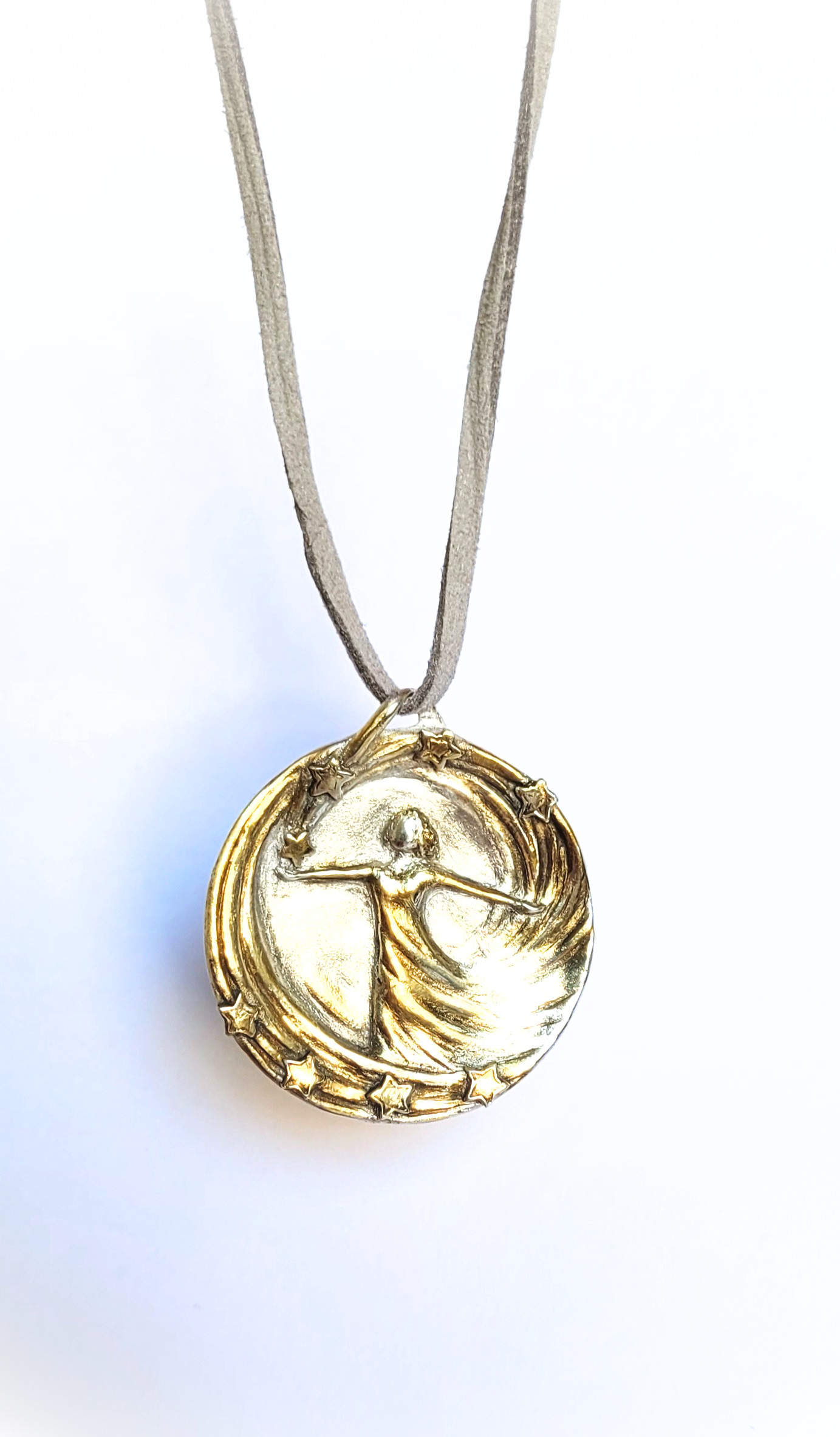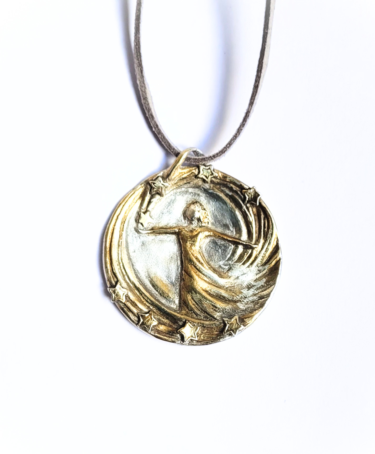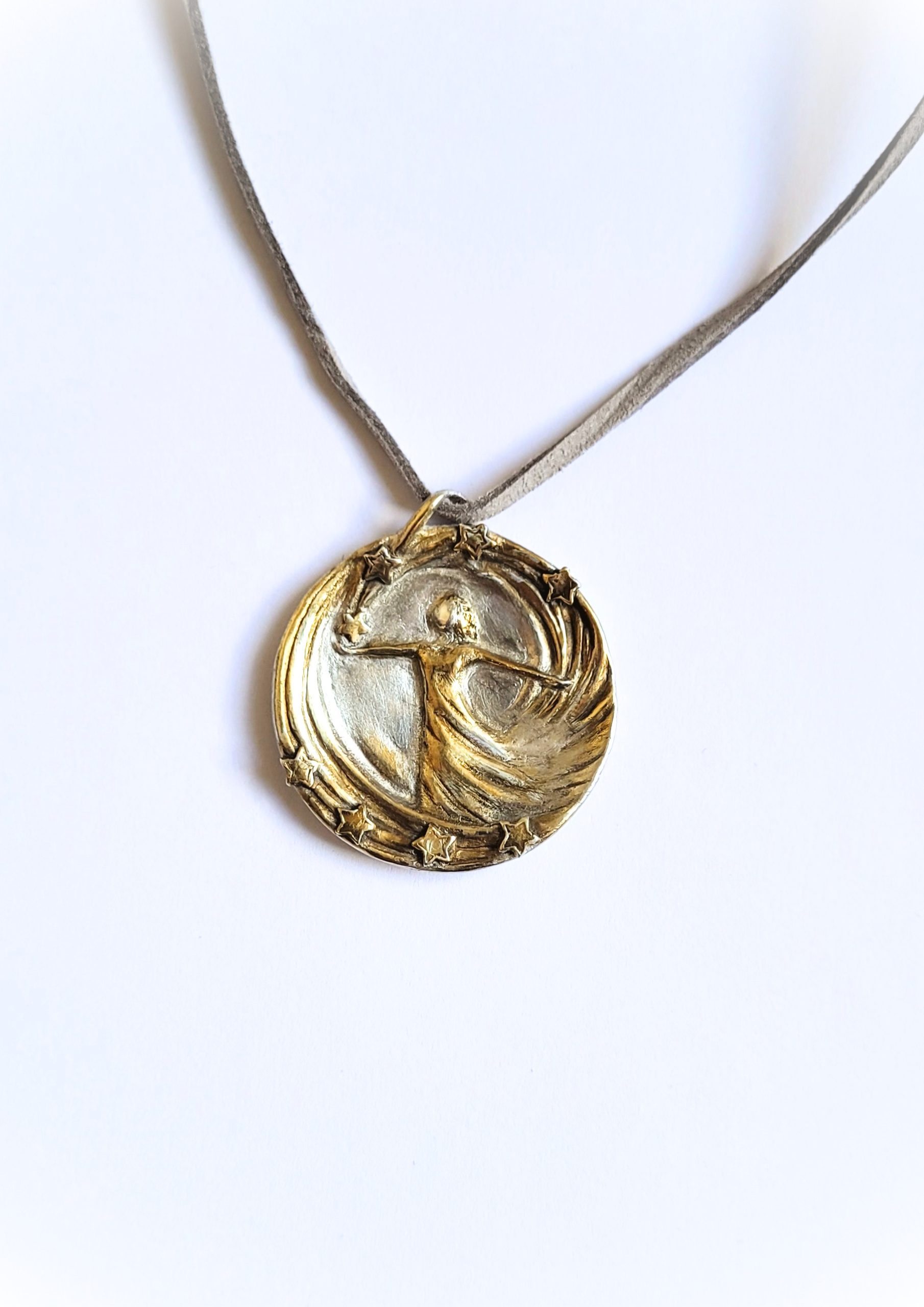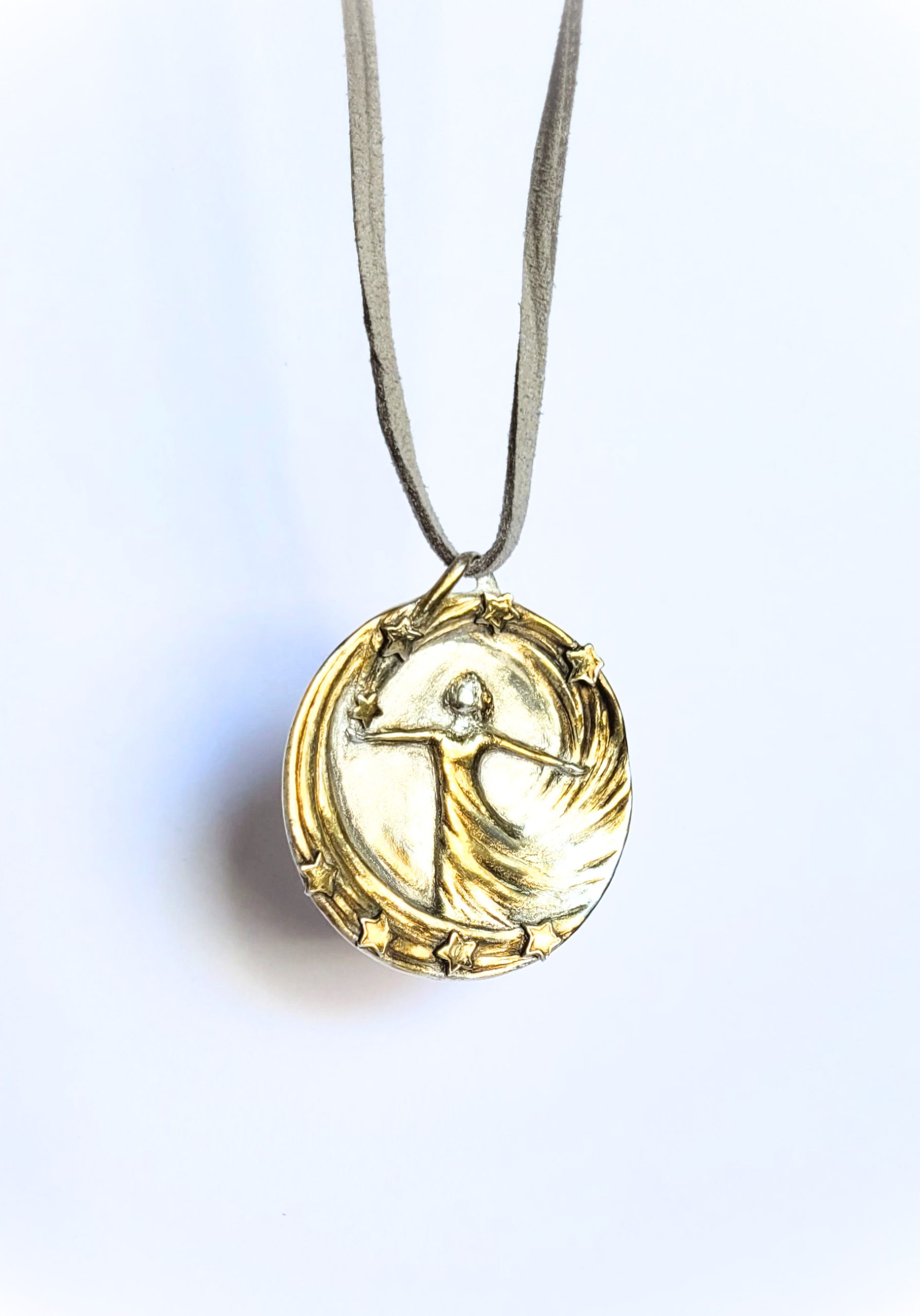 Diese handgefertigte Schmuckmedaille aus Feinsilber mit 24Karat-Vergoldung verbindet die tanzende Figur mit einem funkelnden Sternenkranz – wie ein persönlicher Himmel, den du am Hals trägst. Die Figur öffnet die Arme in einem strömenden Linienwirbel, während sich kleine Sterne oben und unten um sie herum legen und das Motiv in einen goldenen Lichtraum setzen.