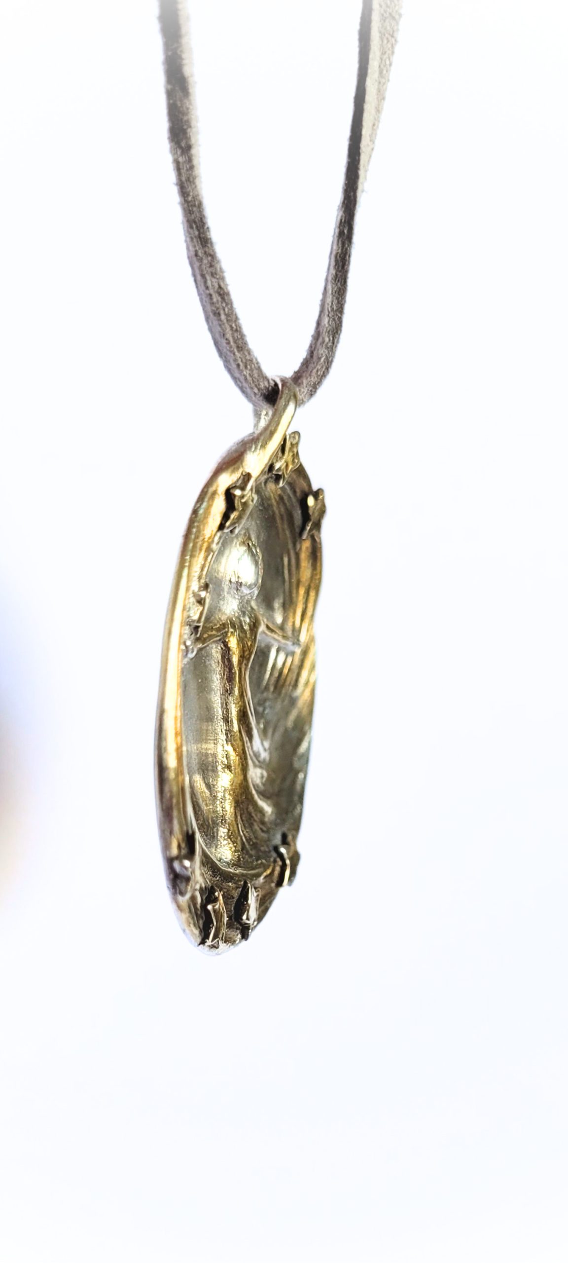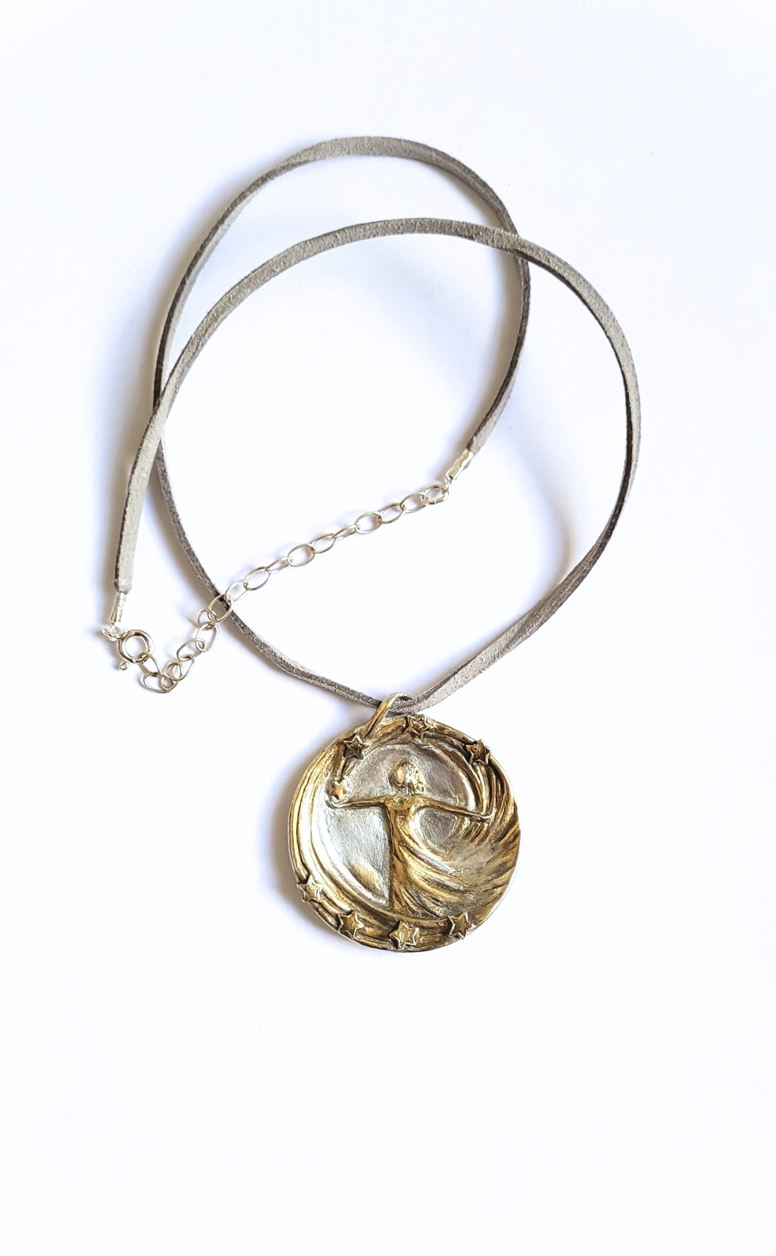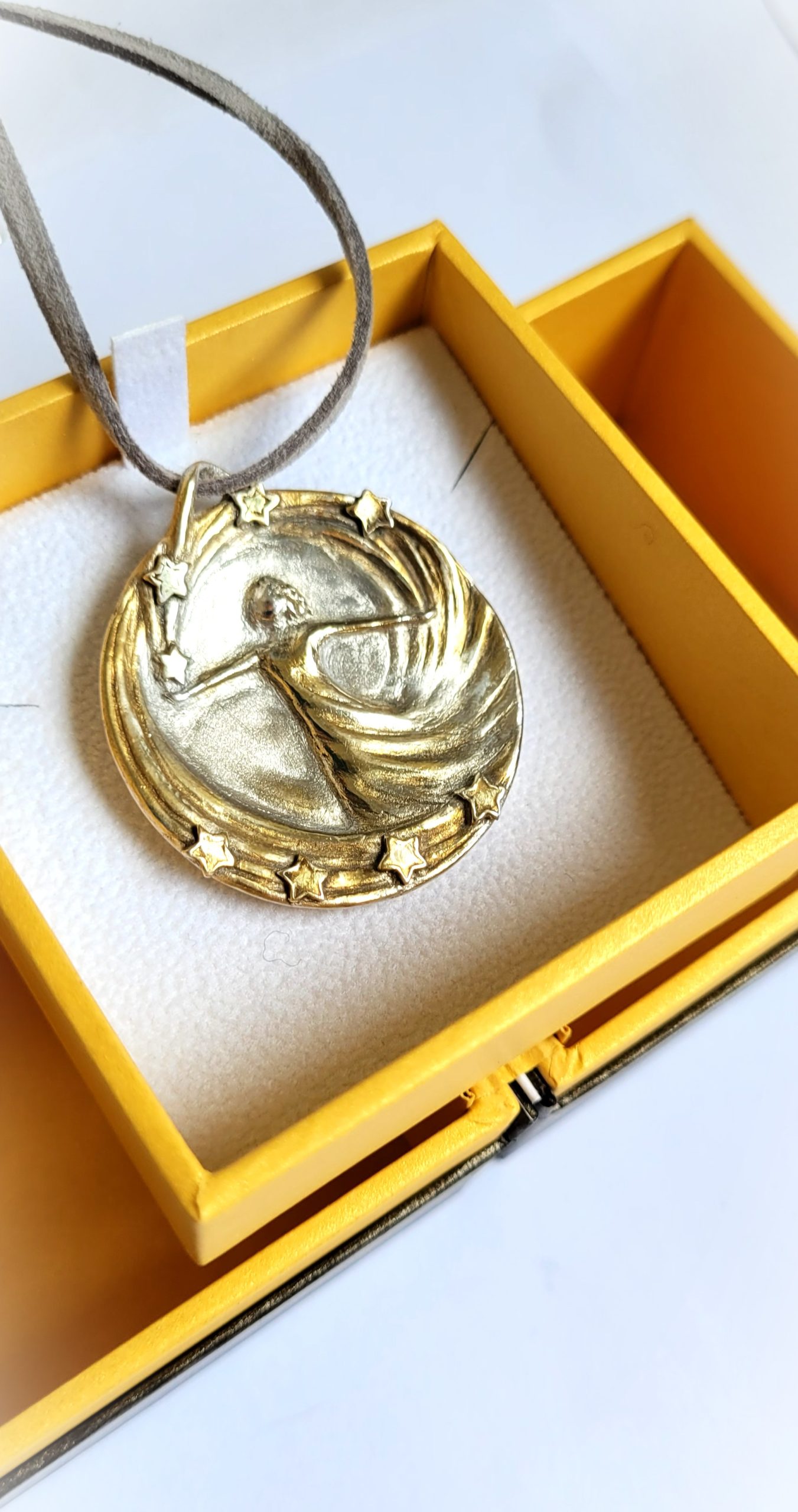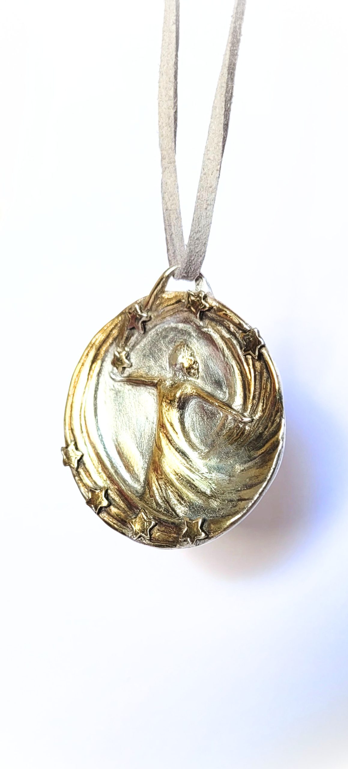 Diese handgefertigte Schmuckmedaille aus Feinsilber mit 24Karat-Vergoldung verbindet die tanzende Figur mit einem funkelnden Sternenkranz – wie ein persönlicher Himmel, den du am Hals trägst. Die Figur öffnet die Arme in einem strömenden Linienwirbel, während sich kleine Sterne oben und unten um sie herum legen und das Motiv in einen goldenen Lichtraum setzen.
