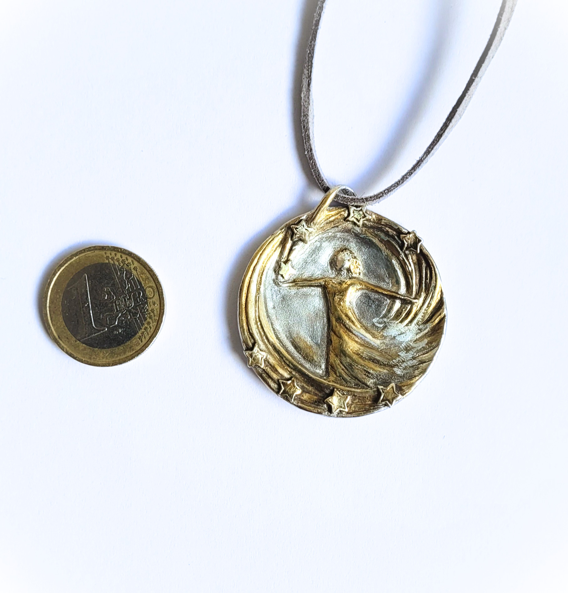 Die Medaille wirkt präsent und zugleich elegant: groß genug, um das Sternenmotiv klar wirken zu lassen, und angenehm im Tragegefühl. Die Sterne greifen das Licht an ihren Kanten auf, sodass der Anhänger bei jeder Bewegung sanft aufleuchtet – mal mehr golden, mal silbrig, je nach Blickwinkel.