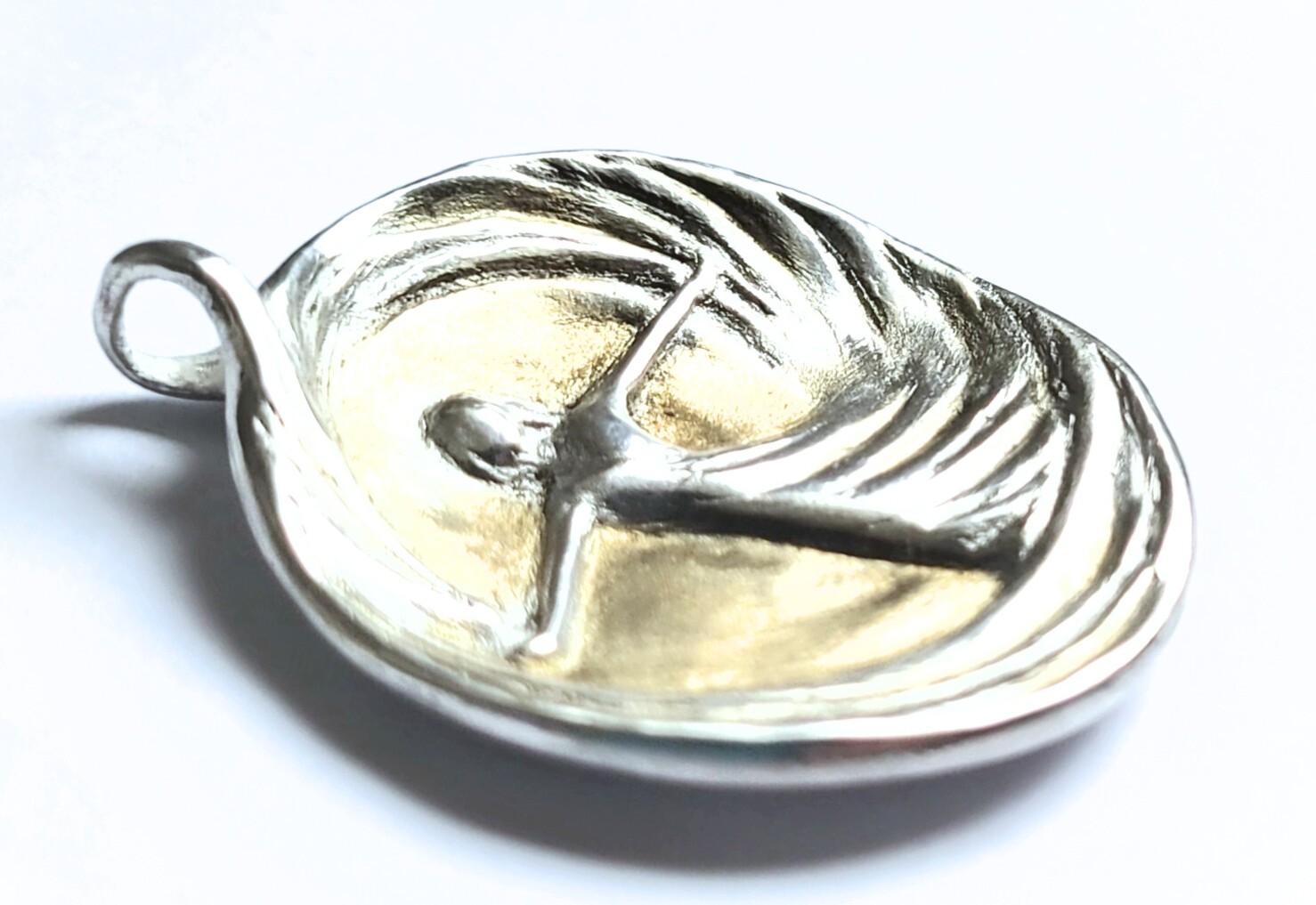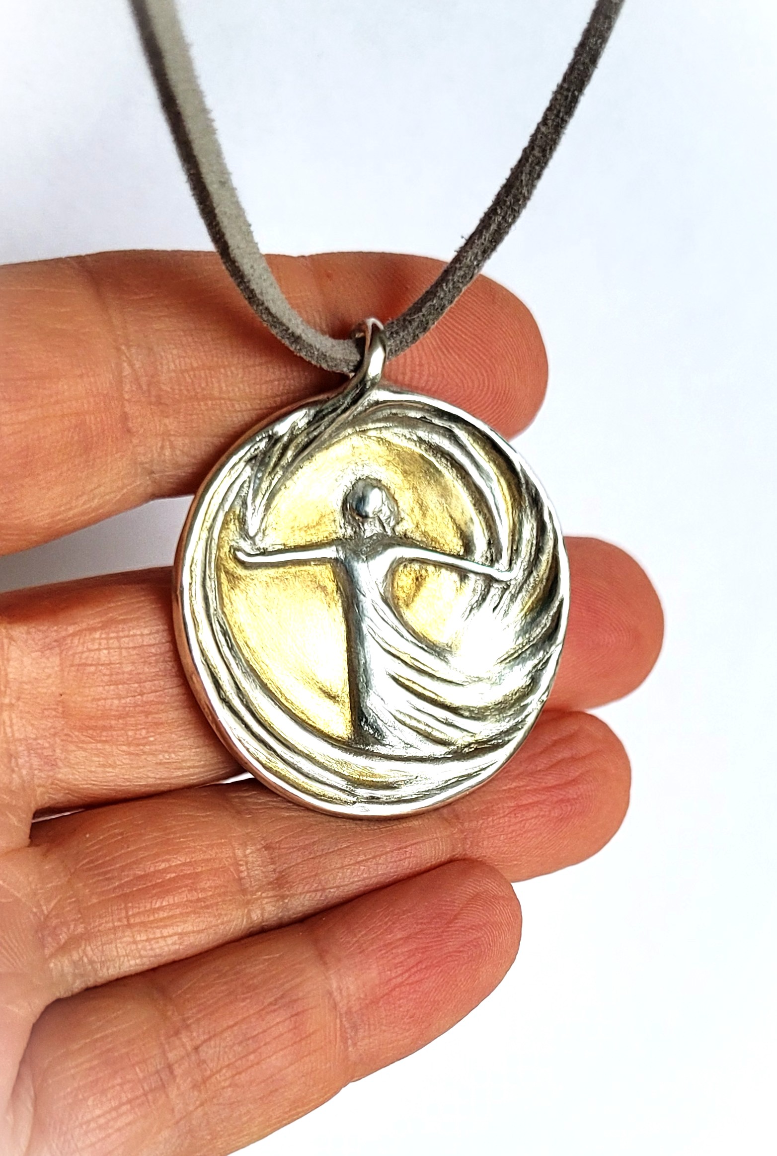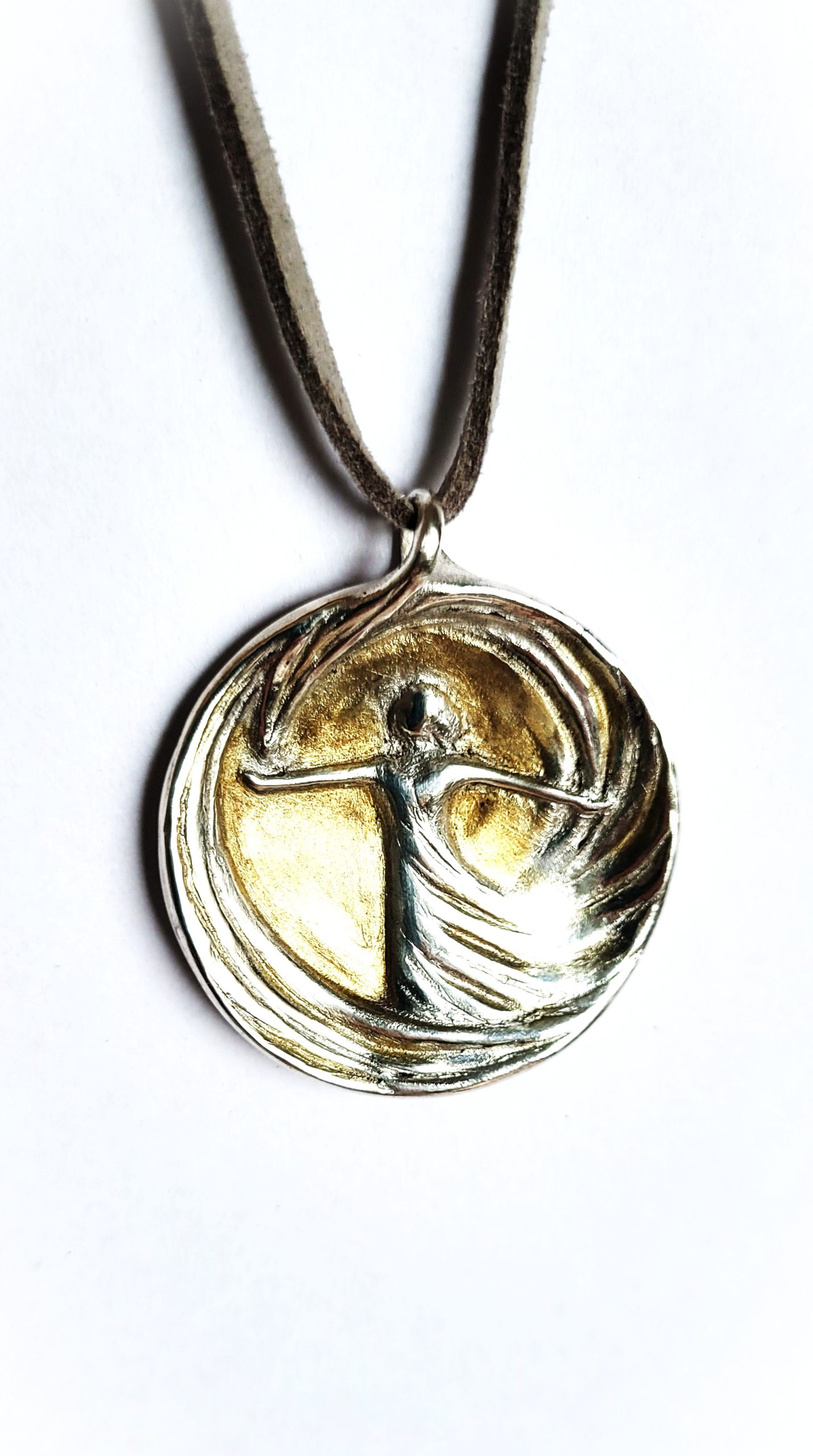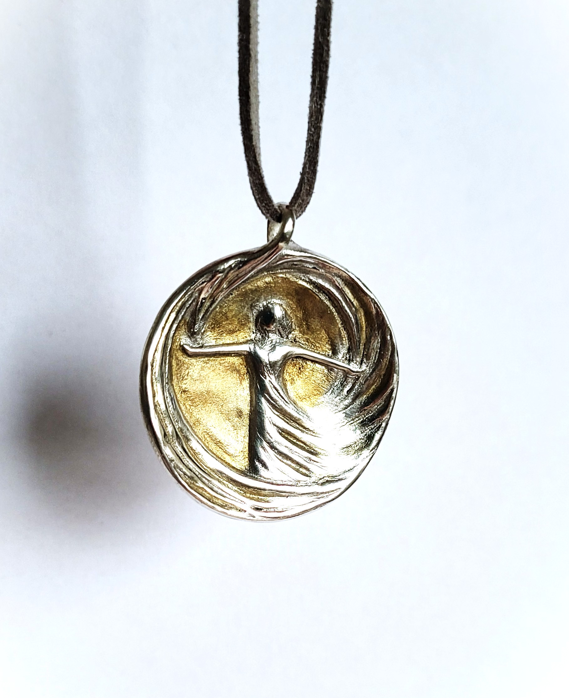 Handgefertigte Schmuckmedaille aus Feinsilber (999) mit 24 Karat Feingold‑Vergoldung: Die tanzende Figur im Wirbel der Linien leuchtet hier wie in einem goldenen Lichtraum, gefasst von einer sanft gerundeten Silhouette. Das Motiv steht für innere Stärke, Lebensfreude und das mutige „Ja“ zum eigenen Weg – ein edles prêt‑à‑porter‑Unikat, das sofort getragen oder verschenkt werden kann.