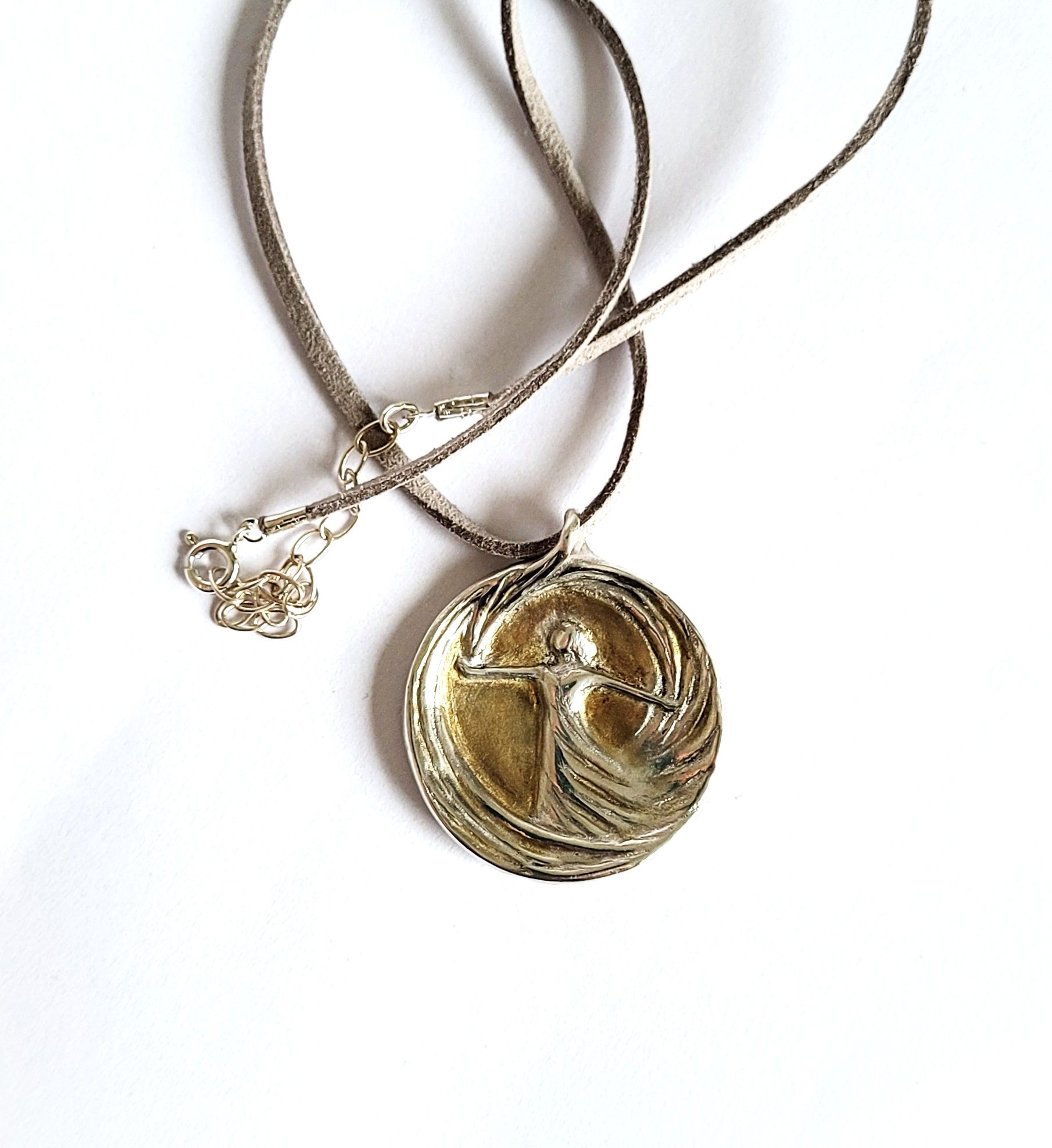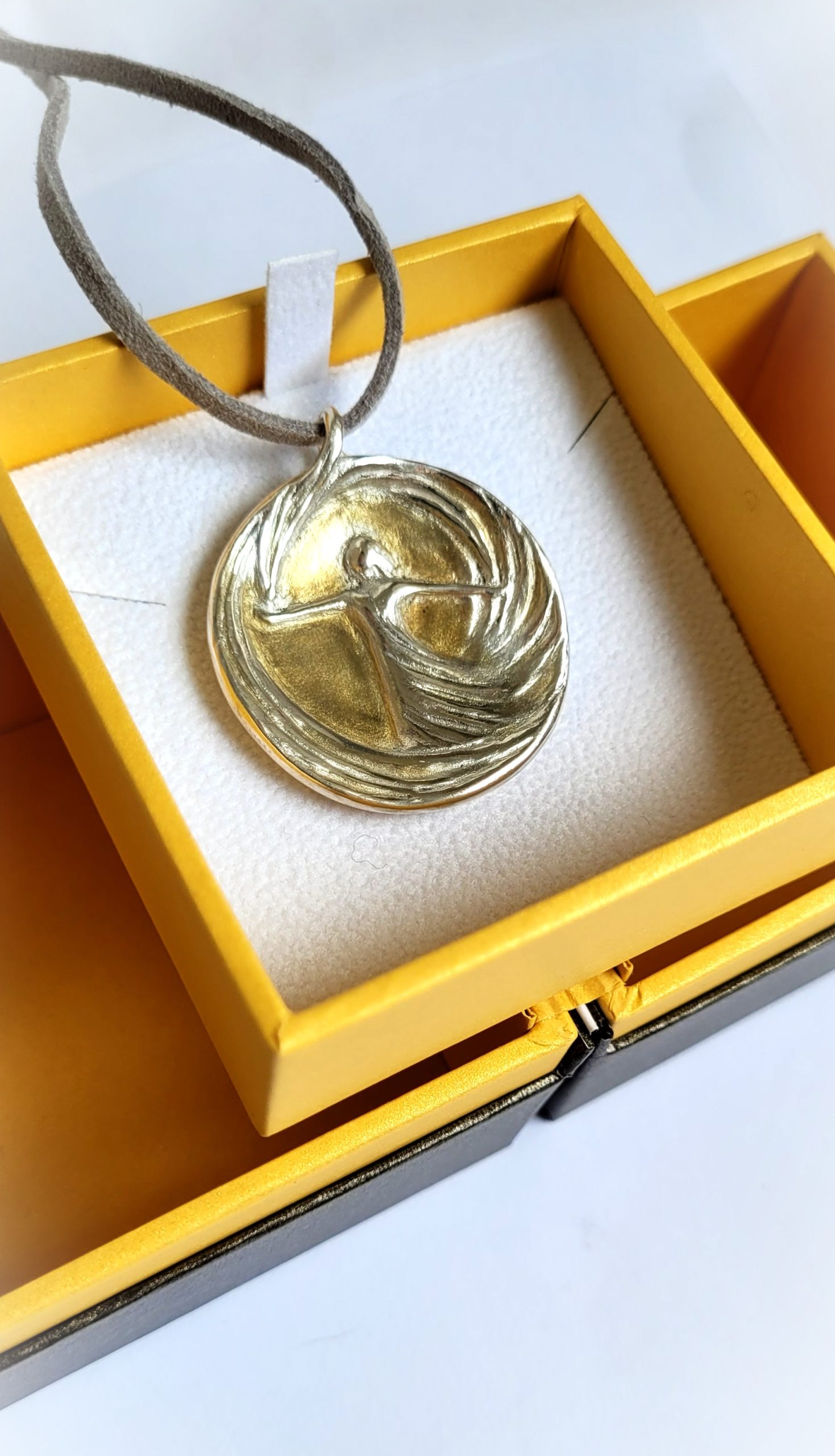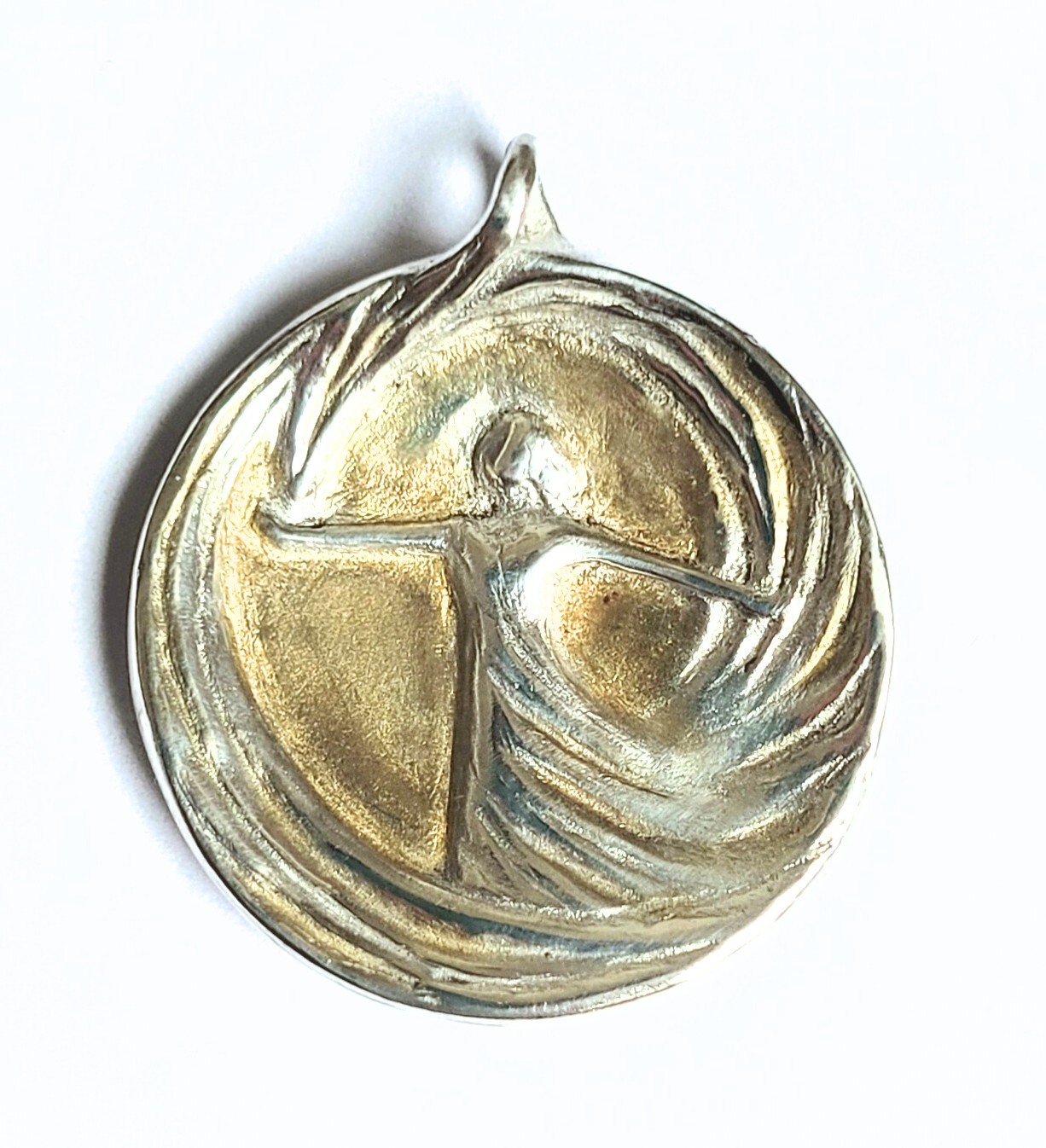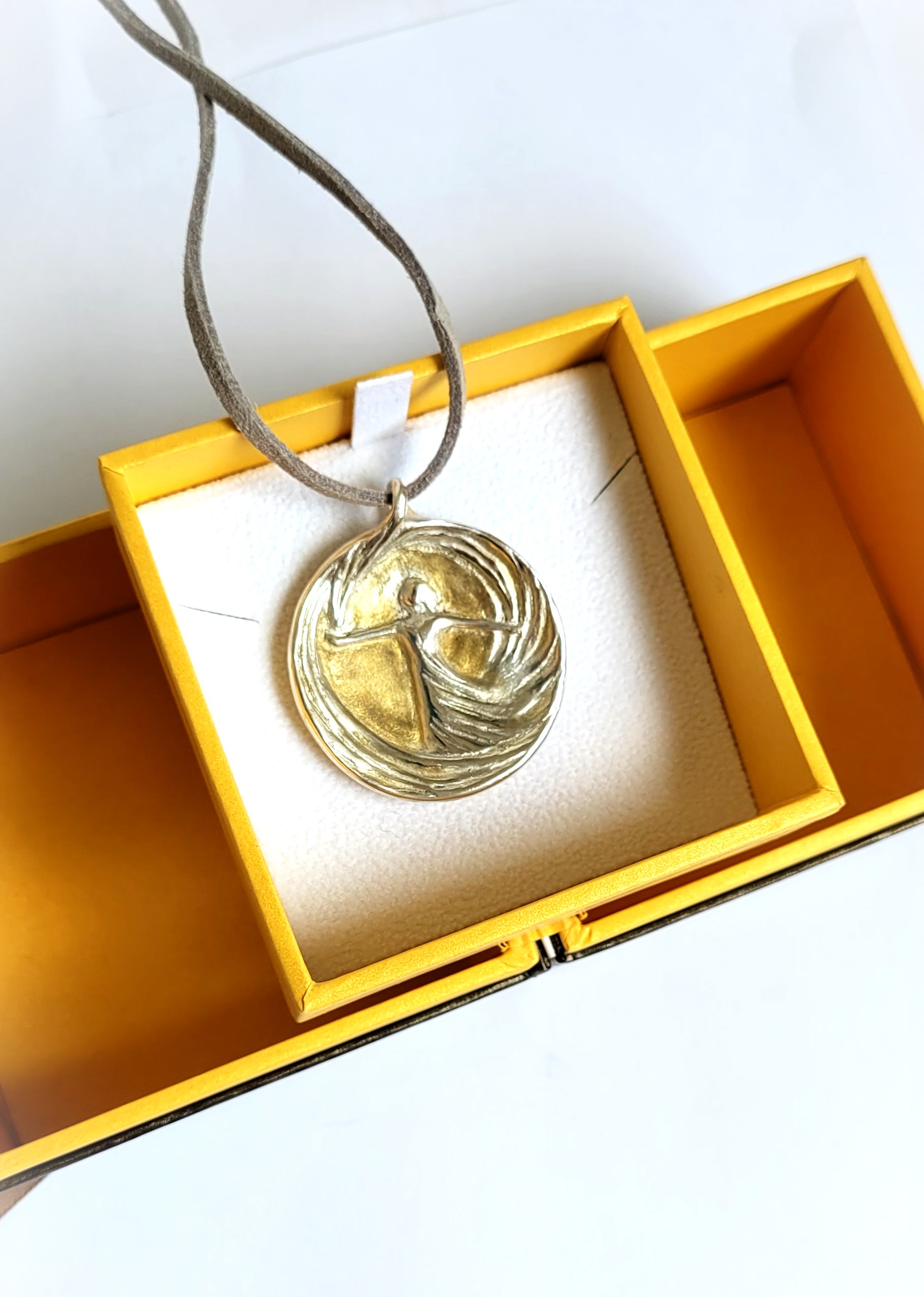 Handgefertigte Schmuckmedaille aus Feinsilber (999) mit 24 Karat Feingold‑Vergoldung: Die tanzende Figur im Wirbel der Linien leuchtet hier wie in einem goldenen Lichtraum, gefasst von einer sanft gerundeten Silhouette. Das Motiv steht für innere Stärke, Lebensfreude und das mutige „Ja“ zum eigenen Weg – ein edles prêt‑à‑porter‑Unikat, das sofort getragen oder verschenkt werden kann.