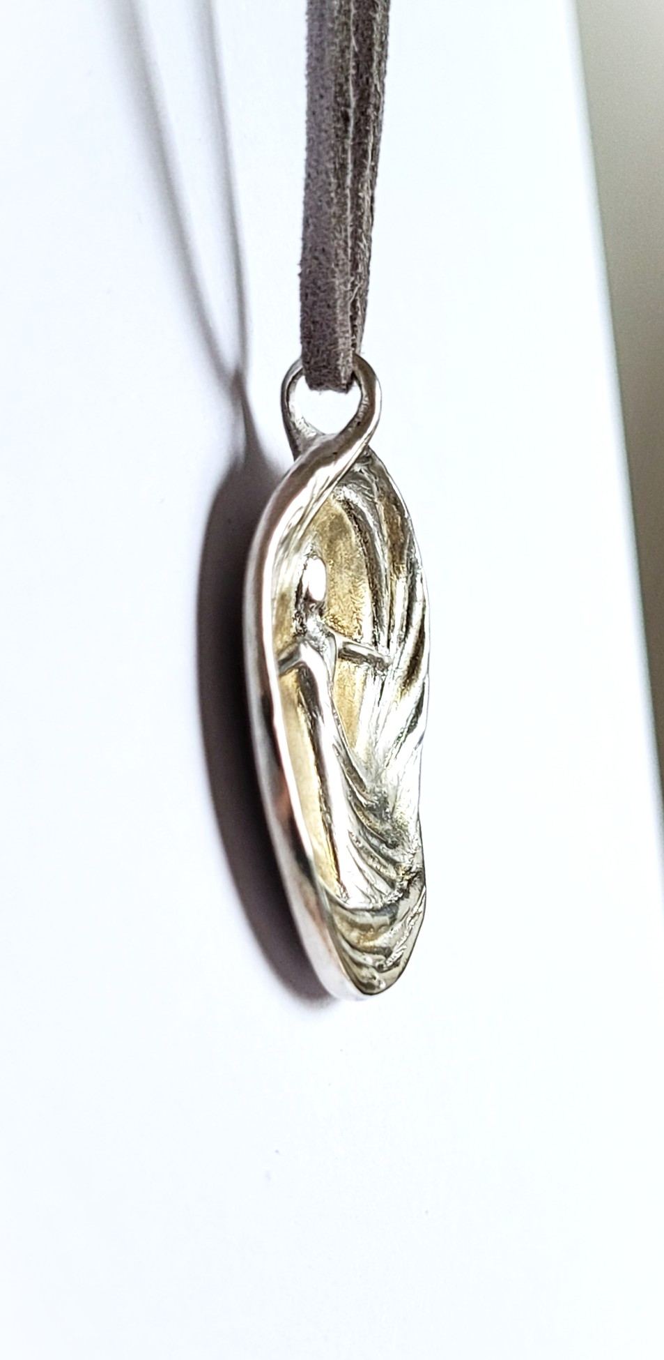 Die Kombination aus mattem Silberrand und warm glänzender Goldfläche lässt die Figur plastisch hervortreten – im Licht entsteht ein lebendiges Spiel aus hellen Reflexen und weichen Schatten.