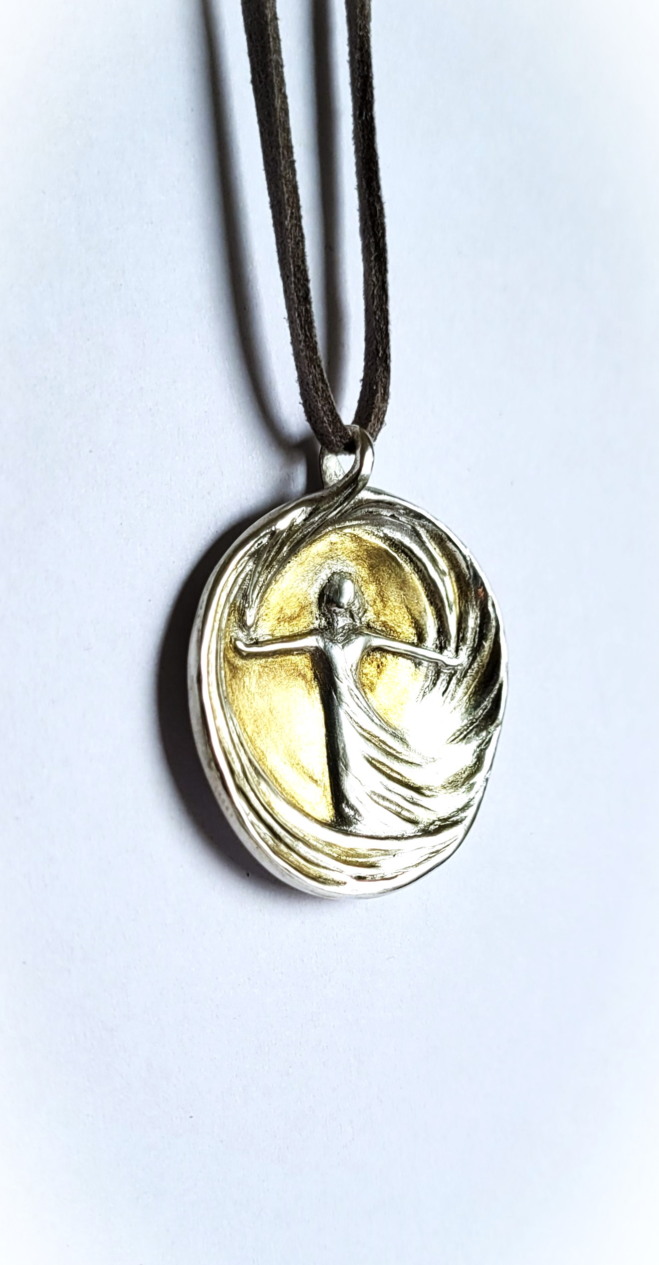 Handgefertigte Schmuckmedaille aus 999er Feinsilber mit partieller 24K‑Vergoldung: eine tanzende Figur im goldenen Lichtraum, eingefasst von einem sanft gerundeten Silberrand. Ca. 3,5 cm breit, 4,1 cm hoch (mit Aufhängung), 2 mm stark, ca. 18,05 g ohne Kette. Inklusive verstellbarer Velourskette (ca. 42–50 cm mit Sterlingsilber‑Verlängerung) und Schmuckbox – ein edles, nachhaltiges Unikat zum Verschenken oder als täglicher Talisman.