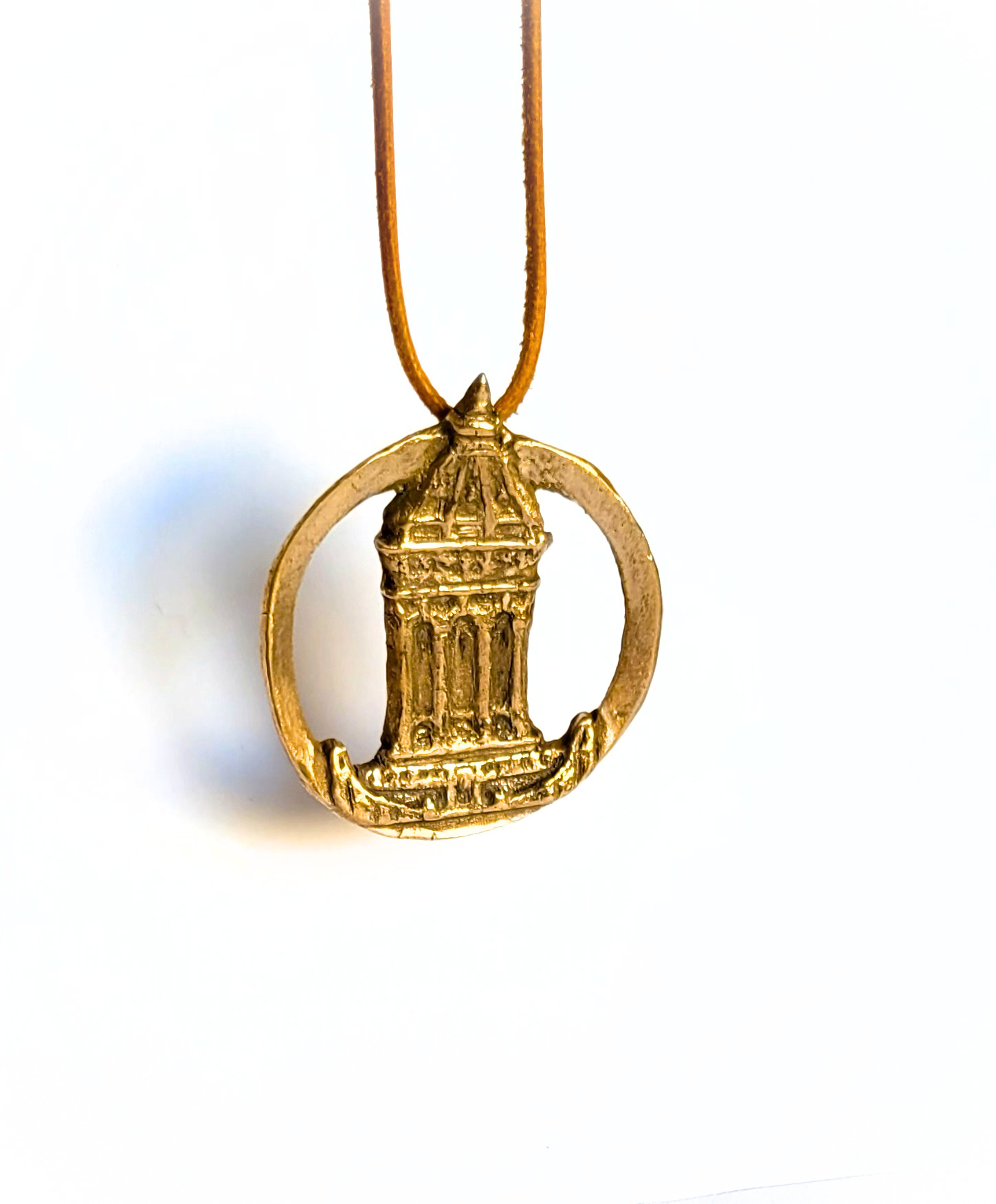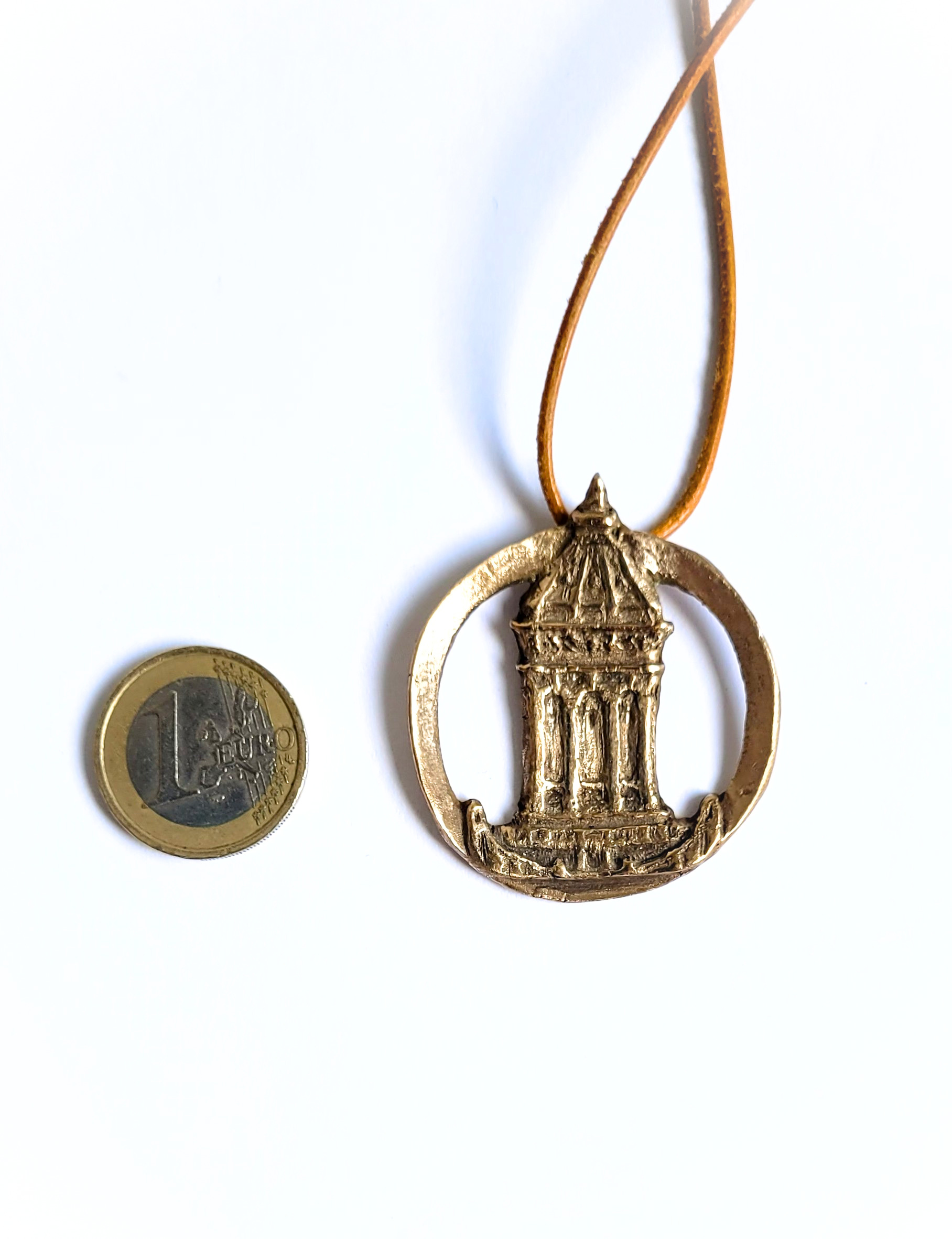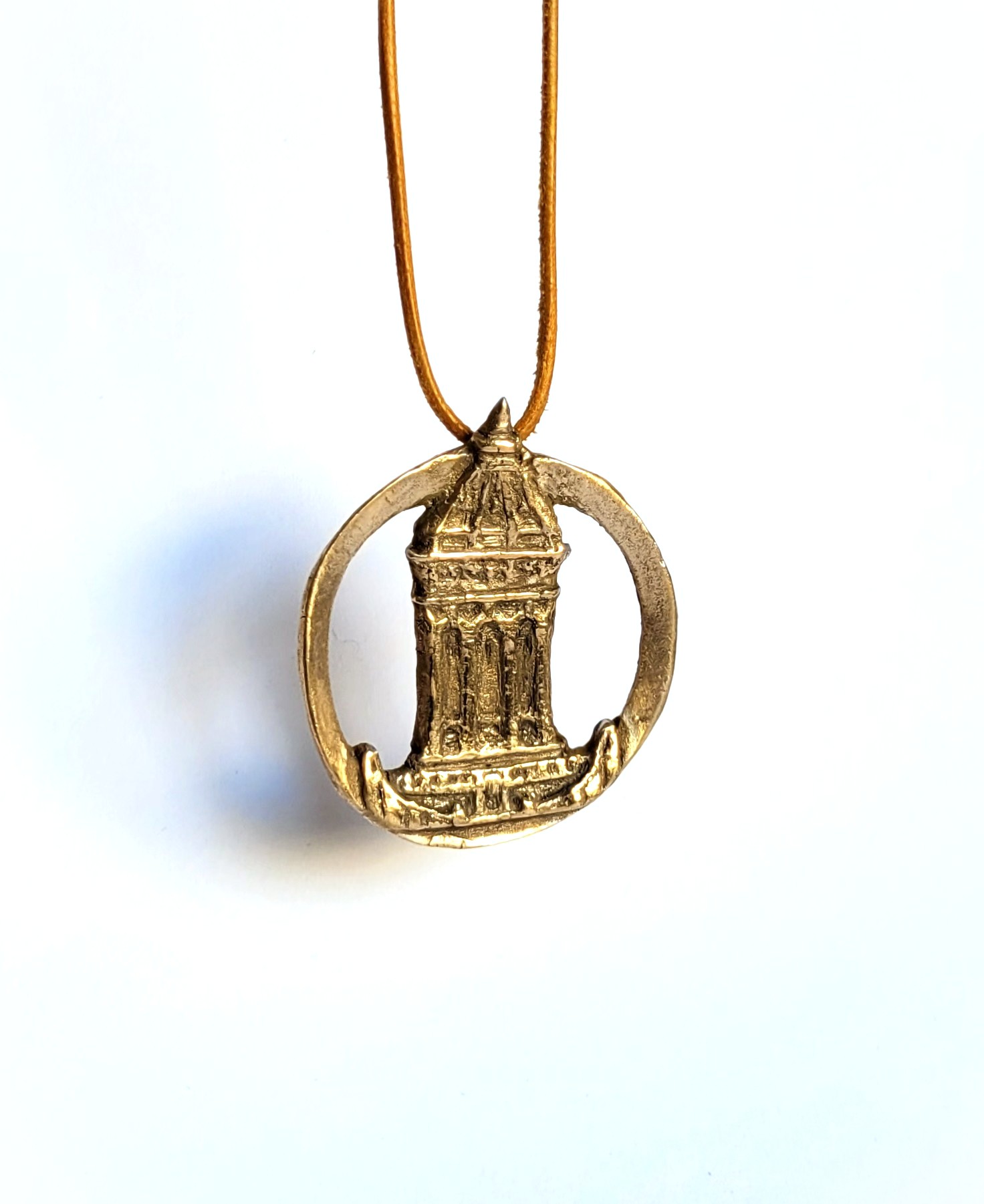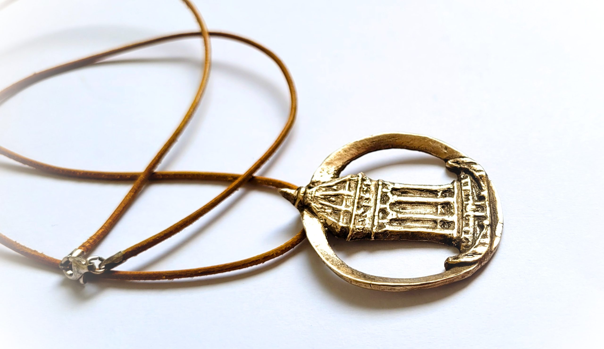 Mannheimer Wasserturm – Schmuckmedaille aus Bronze, ovaler Ring mit hellbraunem Lederband