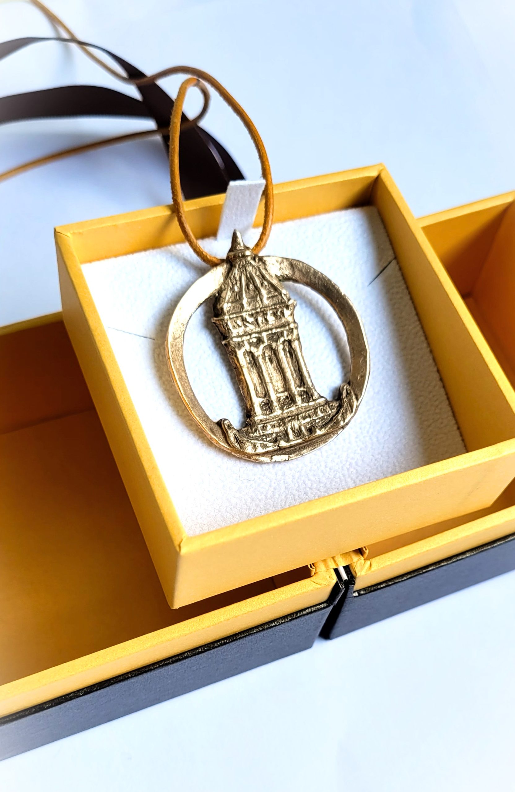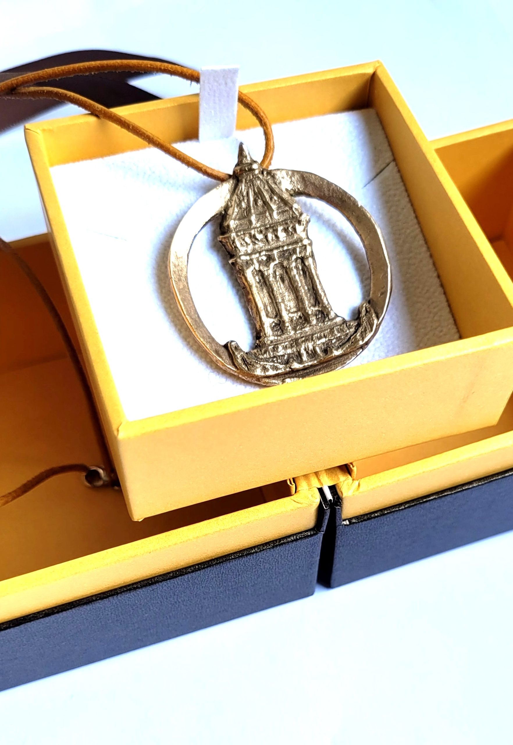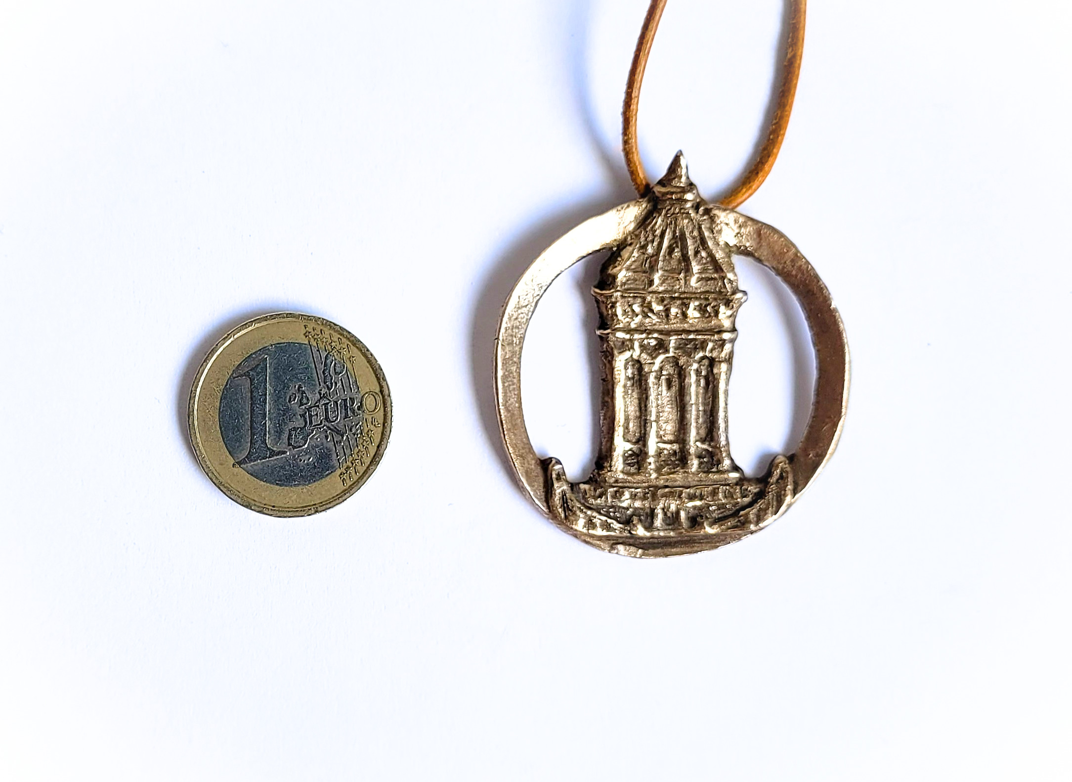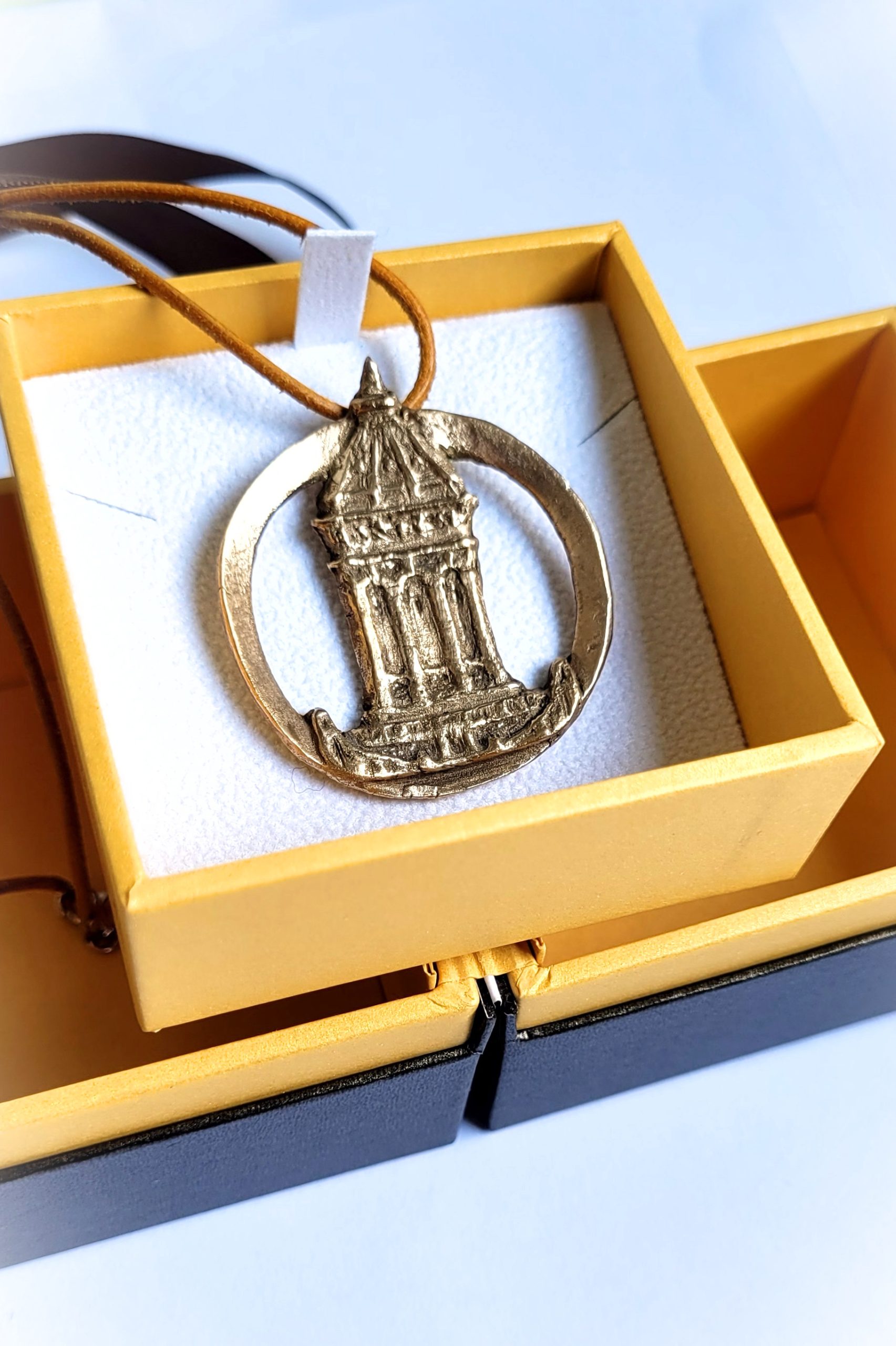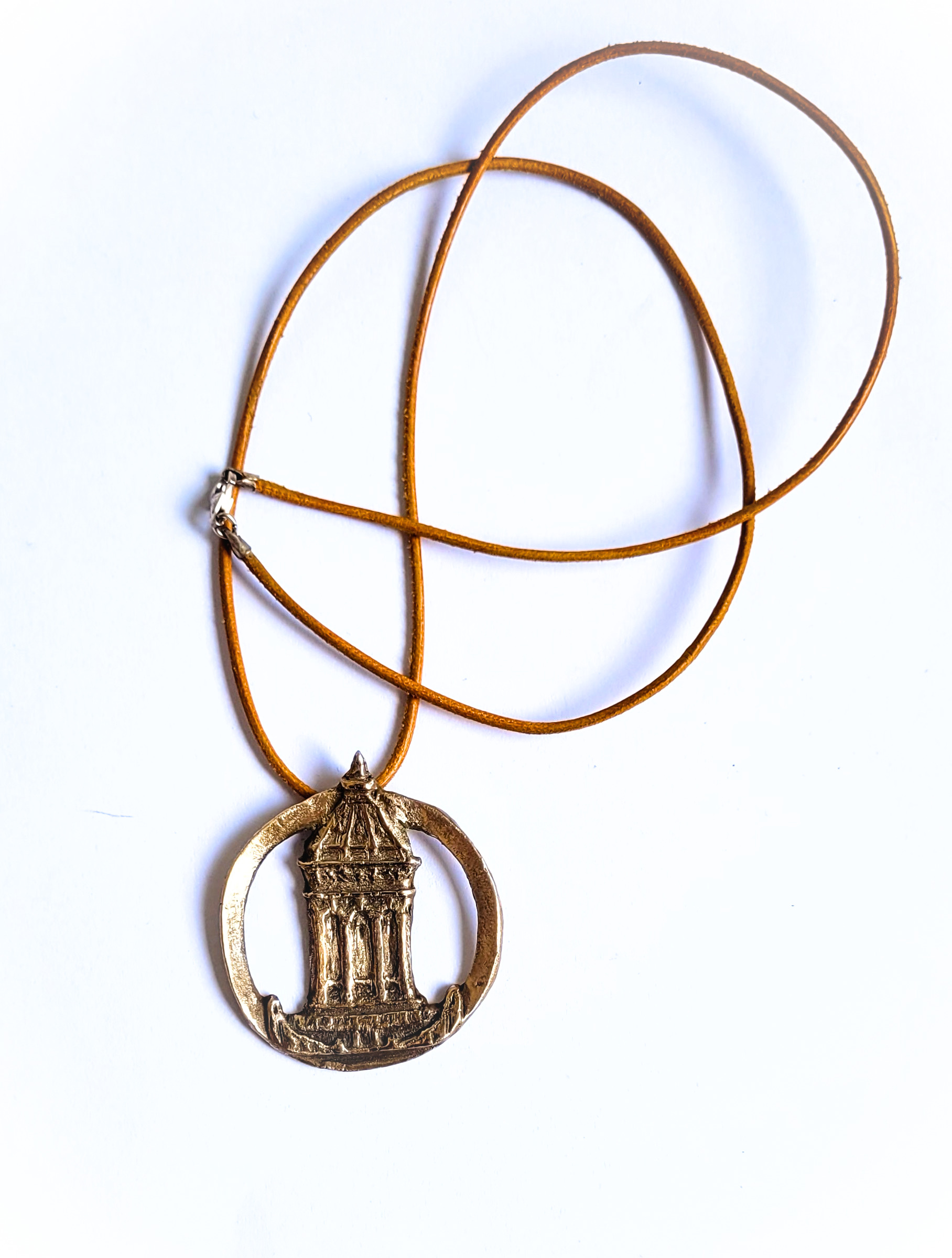 Mannheimer Wasserturm – Schmuckmedaille aus Bronze, ovaler Ring mit hellbraunem Lederband