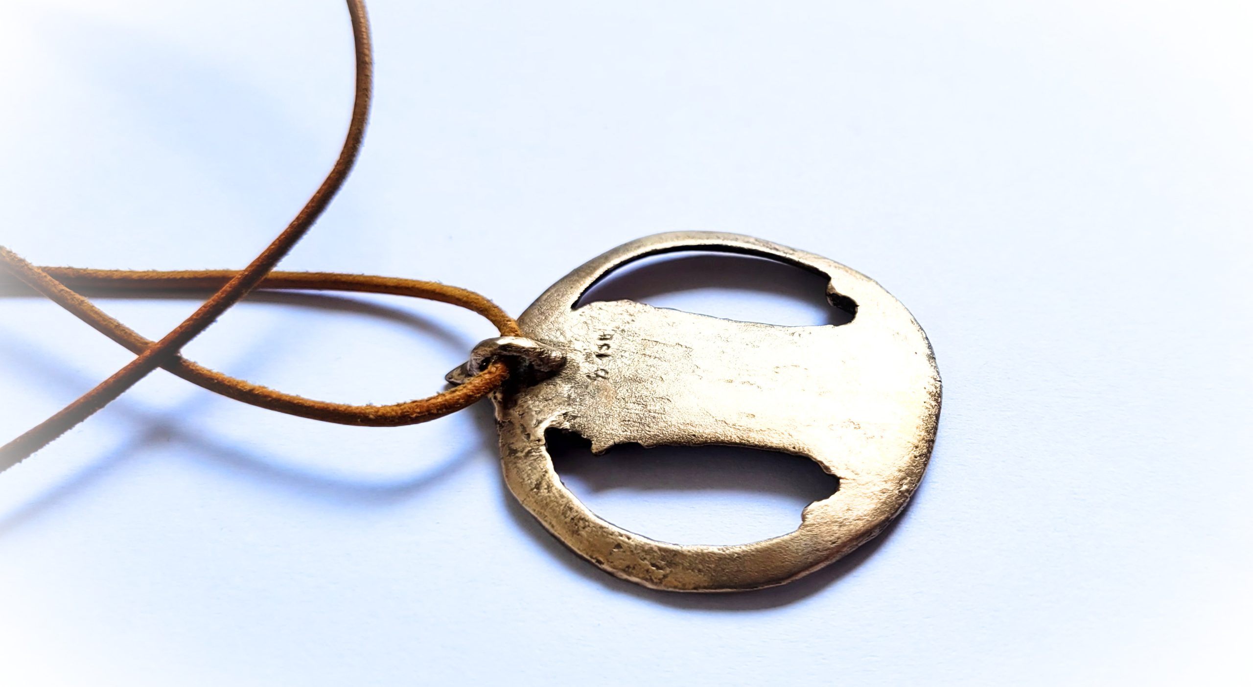 Handgefertigte Schmuckmedaille aus Bronzeclay: Der Mannheimer Wasserturm steht in einem leicht nach innen gebogenen, organisch ovalen Bronzekreis, der bewusst nicht perfekt rund ist. Kleine Unregelmäßigkeiten in Kontur und Oberfläche, der sanft gebogene Turm und das warme Bronze verleihen der Medaille ihren „perfekt unperfekten“, erdigen Charakter – sie liegt angenehm am Hals.