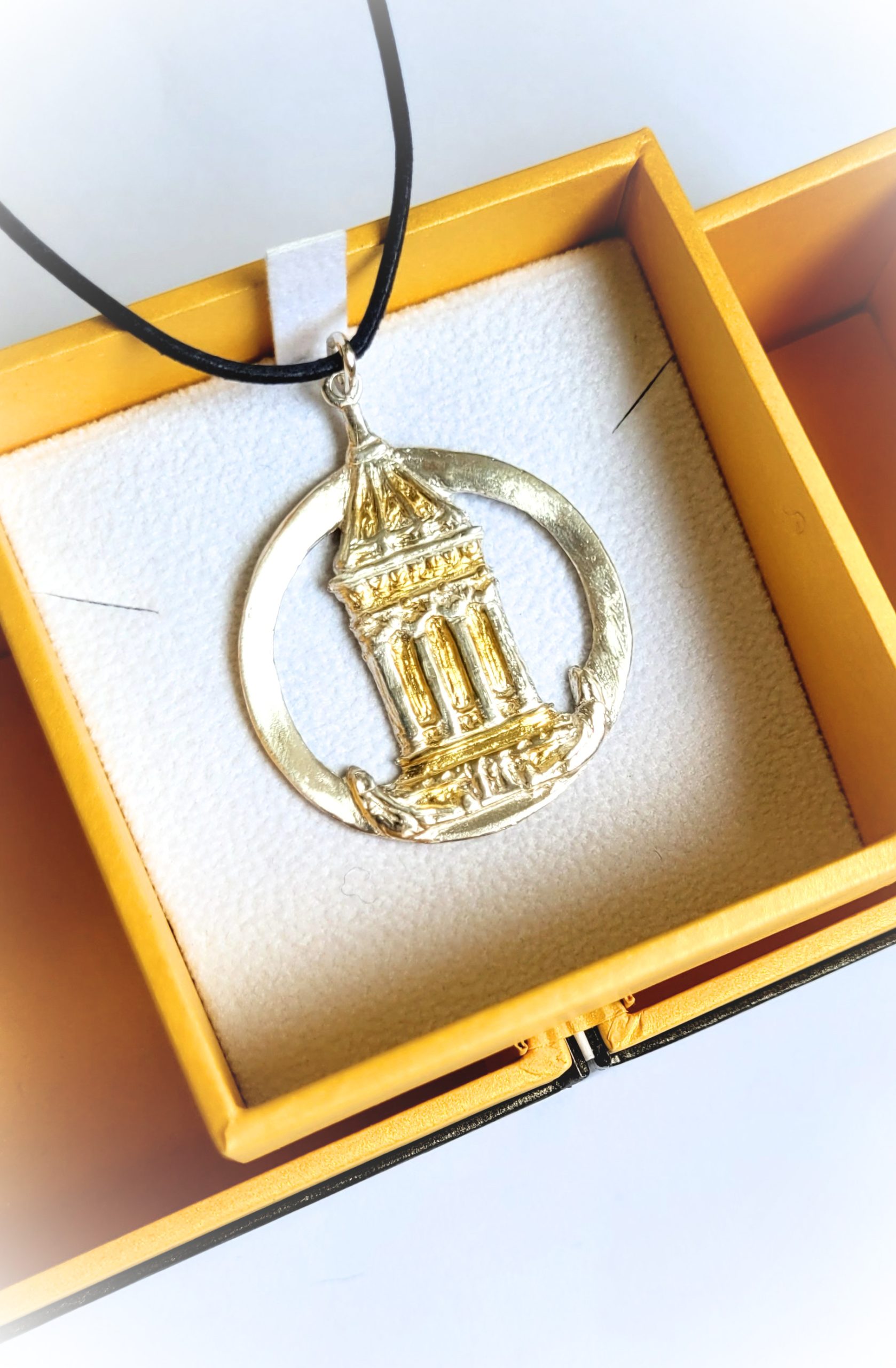 Handgefertigte Schmuckmedaille aus 999er Feinsilber: Der Mannheimer Wasserturm erscheint als feines Relief in einem Silberkreis, dessen Architekturdetails mit 24‑karätigem Gold vergoldet sind – Säulen, Dach und Sockel leuchten warm aus dem kühlen Silber hervor. Die kompakte Größe und das leichte Gewicht machen diese zweifarbige Medaille zu einem alltagstauglichen Begleiter mit festlichem Charakter.